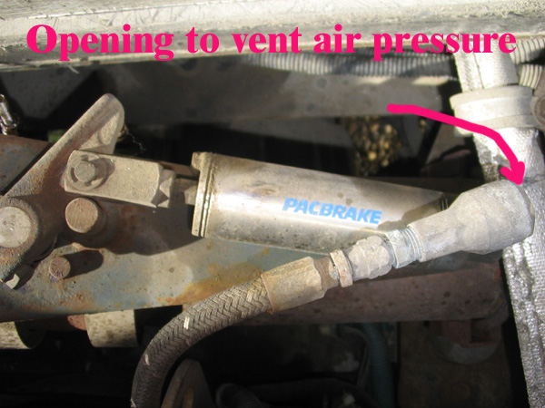 An image of our Pac Brake with the original style Quick Release (QR) valve. There is a short pipe nipple between the PacBrake cylinder and the QR valve. The port in the QR valve on ours was heavily worn from vibration and leaked a lot.