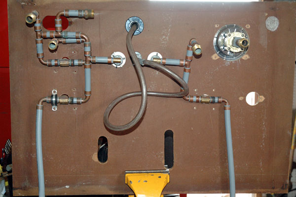 This photo shows what it looks like with both panels removed. This photo was taken before I switched from PEX tubing cold and hot water drain lines to stainless steel jacketed flex hoses.