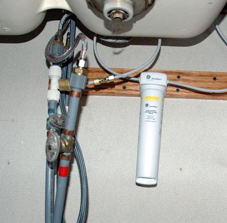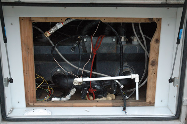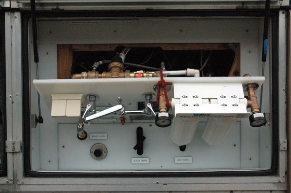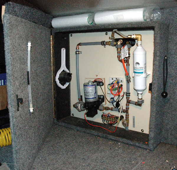 The water pump compartment is located in the basement just forward of the wet bay. The ice maker filter was replaced with a larger and higher quality filter. Spare filters for the main water filters are stored on top of the water pump compartment. The tubing velcroed to the door is the winterizing bypass for the ice maker filter.