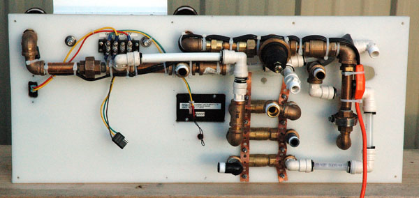 The rear view of the new panel. The plumbing is a mix of brass and SeaTech PEX fittings to cope with the 3" clearance behind the panel. It took two months and well over 100 iterations of the plumbing to solve all the clearance issues. The orange cord is a 3' heat tape on the brass piping run. An additional 6' heat tape was added to the plumbing run in the basement as well as an 18' LED ribbon light assembly around the holding tanks.