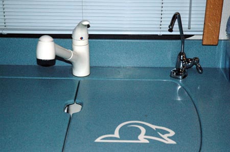 | Water pump switch to the right of the filters next to the soap dispenser. A bright pilot light is mounted just below the SeeLevel panel. An additional water pump switch was added to the bathroom next to the toilet. | |