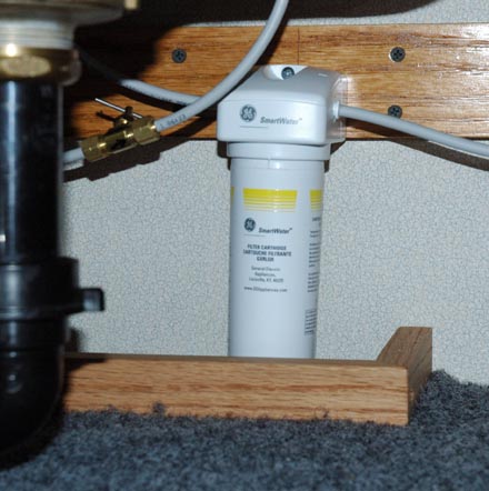 | Install 2 permanently mounted "whole-house" size water filters. Leave room for the possible addition of a UV filter later. | |