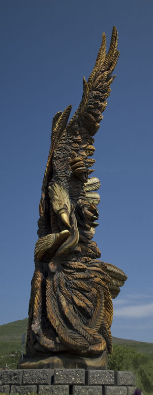 Check out the size of the cinder blocks to get an idea of the size of this carving. I'd guess it's 15' tall & beautiful.