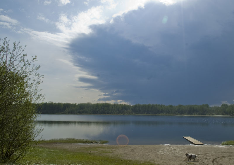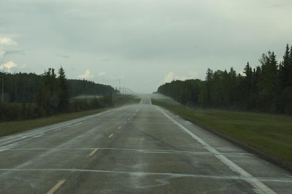 We discovered the hail when we stopped at Twin Lakes Provincial Park about a mile later. Hail stones as big as golf balls. Some folks in a minivan in front of us got their hood thoroughly dimpled. There were 2 RVs in the park at the time and both received extensive damage. All we got was photos. Whew!!