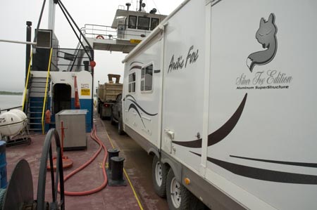 Our first view of the Fort Providence Ferry. No fancy terminal or dock here. We had to shift into low range, 4-wheel drive to get off the ferry on the other side because of the dip and mud it beached on. We think they get a kick out of watching the RVers deal with it.