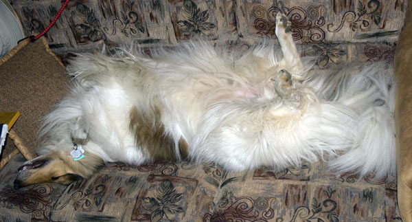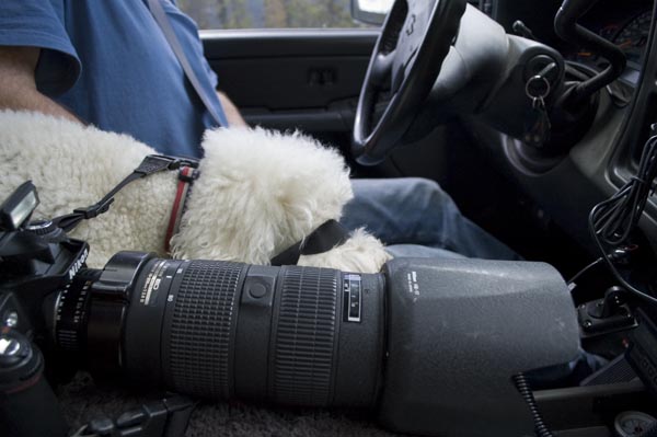 Bo'sun sleeping on the center console, oblivious to the camera strap over his face.