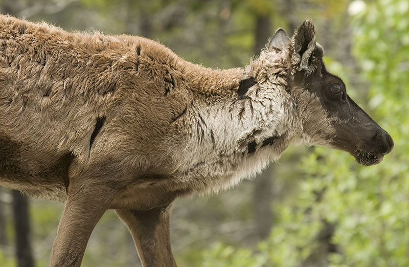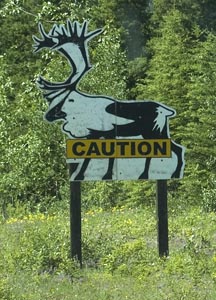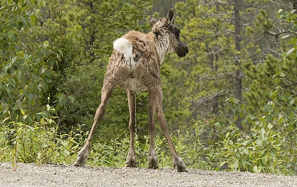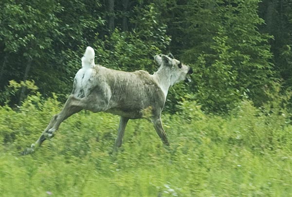 This crazy caribou heard us coming and ran along the road for nearly a minute before we got past him. We were afraid he'd zig in front of us, so we passed him very carefully. Most caribou pay little attention to traffic, but this one was crazed.