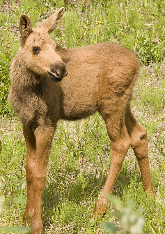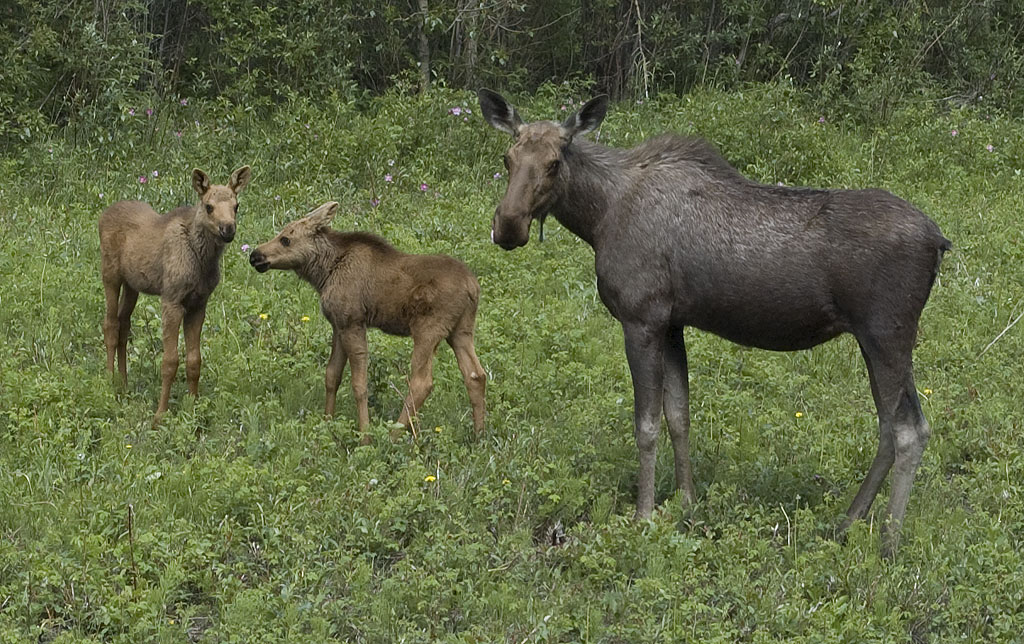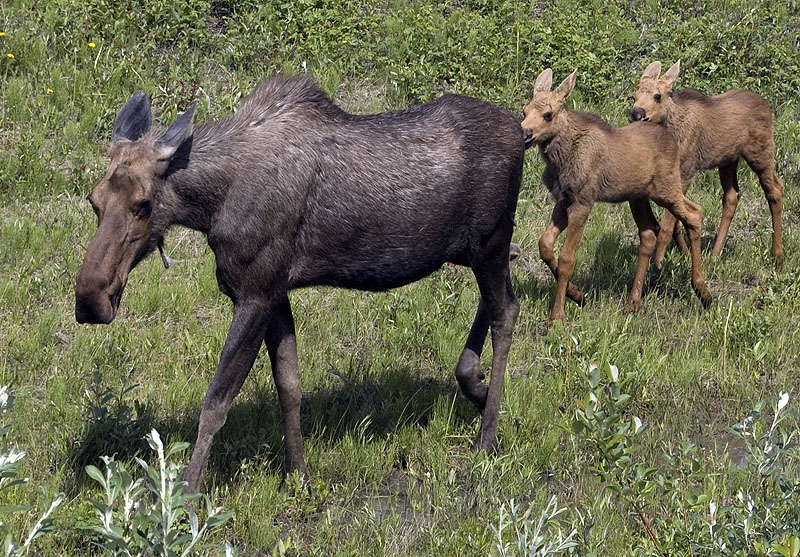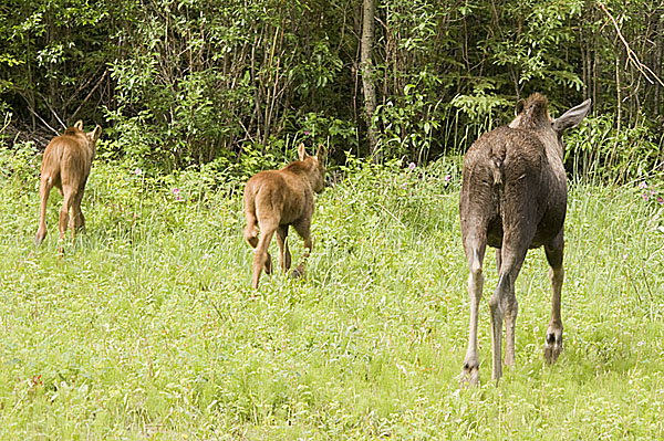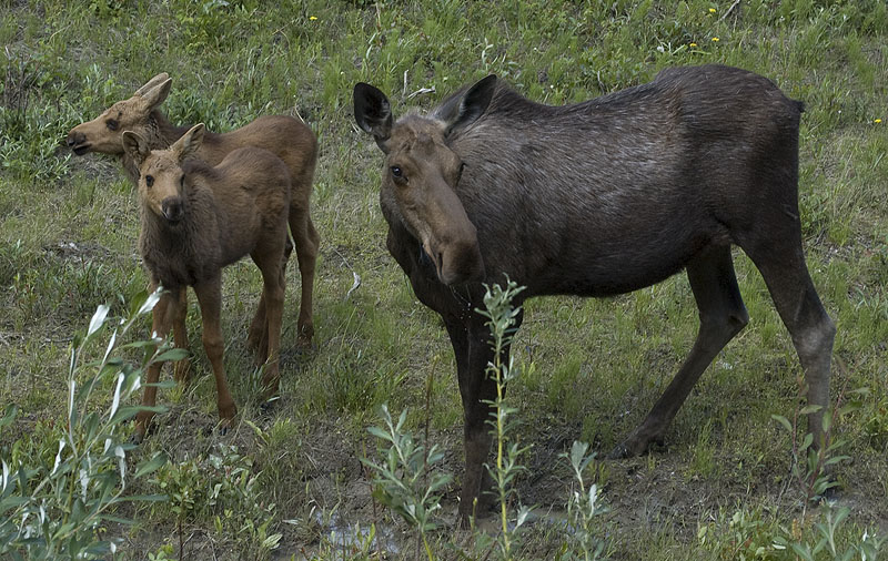 A mother moose and her two calves. CJ stayed in the truck with her D70s and short zoom while I got out and stood between the truck and trailer with my long zoom. The first three photos are CJ's from inside the truck.