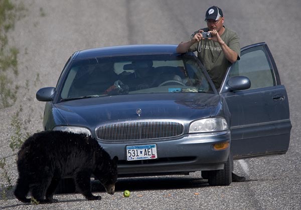 This particular idiot was from Minnesota. He put an apple on the road in front of his car and then hid behind the door to get a photo. The bear turned out to be smarter than he was and left the area without the apple.