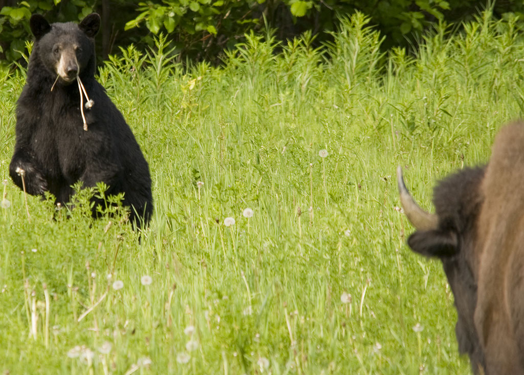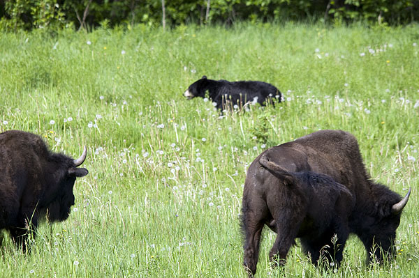 After rearing up on his hind legs to impress the bison, the bear decided that moving a bit further away was a better idea.