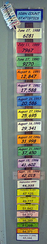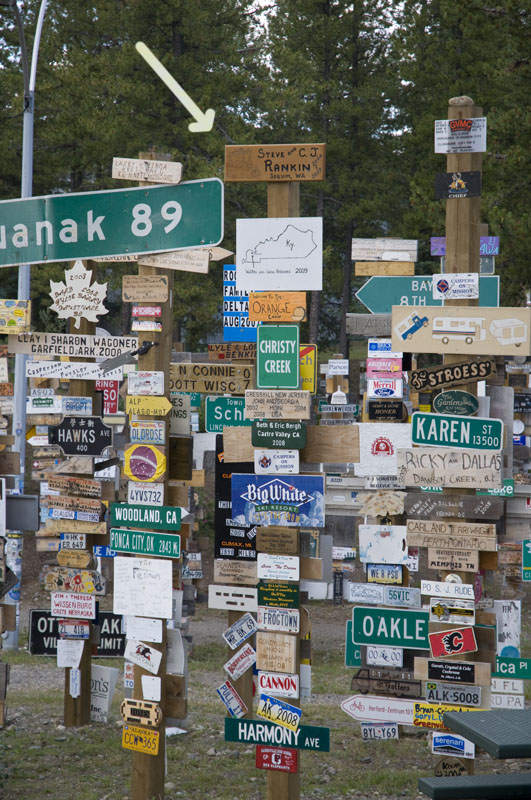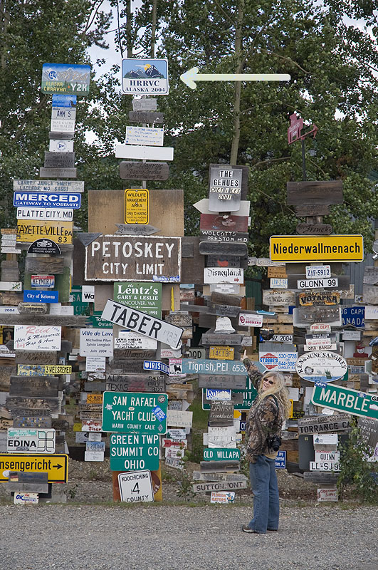 Watson Lake is the home of the famous sign forest. Steve puts up the old name board we had made for our Beaver motorhome as our contribution to the forest.