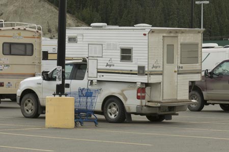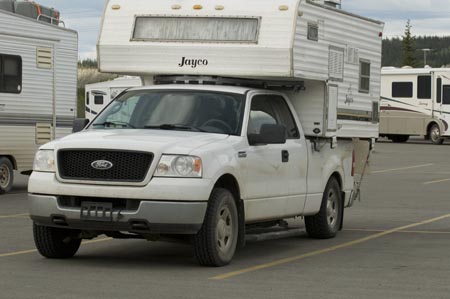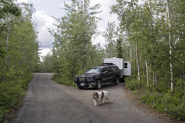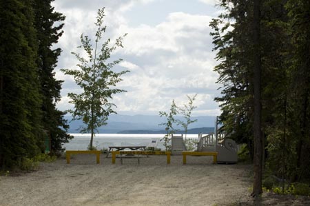 The campground at Teslin Lake was pretty tight. Most of the sites weren't long enough for us. We fit in this one, but not by much.
