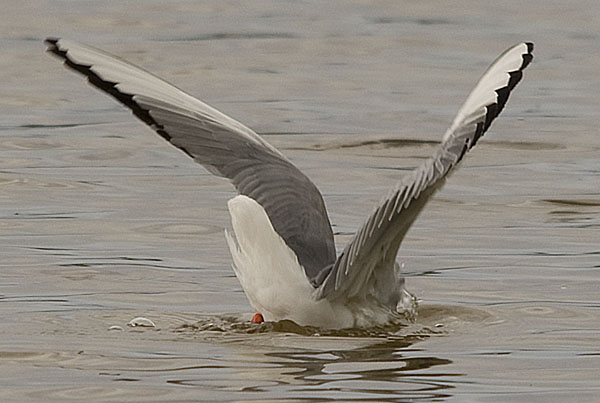 The Bonaparte's Gull technique is very interesting and a challenge to photograph. He stares down into the water from his floating position and when he spots his target, he jumps up out of the water and dives so quickly that I only got one photo of him with his wings partially raised for the jump.