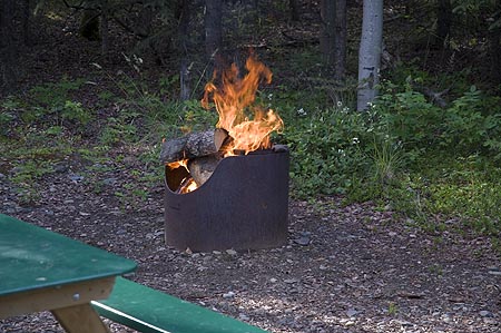 Getting the fire ready to cook a couple of juicy steaks. The parks in the Northwest Territories have free firewood for the campers.