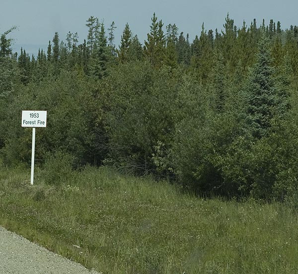 Many of the sites of former forest fires have signs like this one indicating which year the fire burned. This is all these trees have grown in 56 years due to the short growing season.
