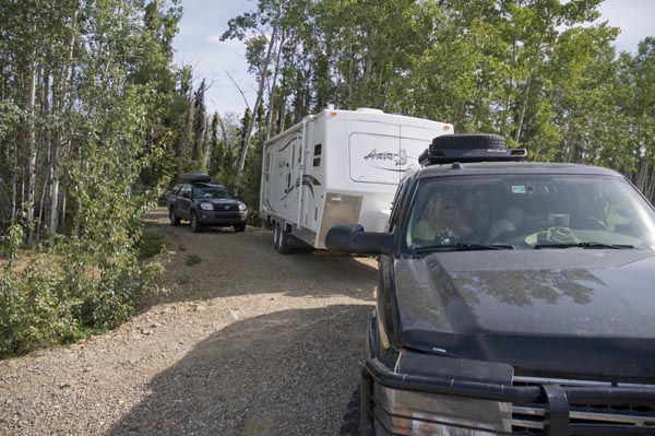 We spotted this broken down Toyota 4Runner on the side of the road shortly after leaving Moose Creek campground. The Toyota was much closer to the highway on this small service road, but we got him further back so we could get our rig off the highway for obvious safety reasons. The owner of the Toyota turned out to be a "Crown Attorney" who'd traveled to Mayo, YT for a trial. He had his mother and two sons with him.