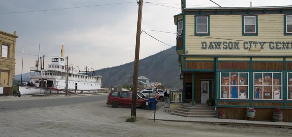 Front Street in downtown Dawson. The river boat is a fascinating museum, where the docents where period dress.