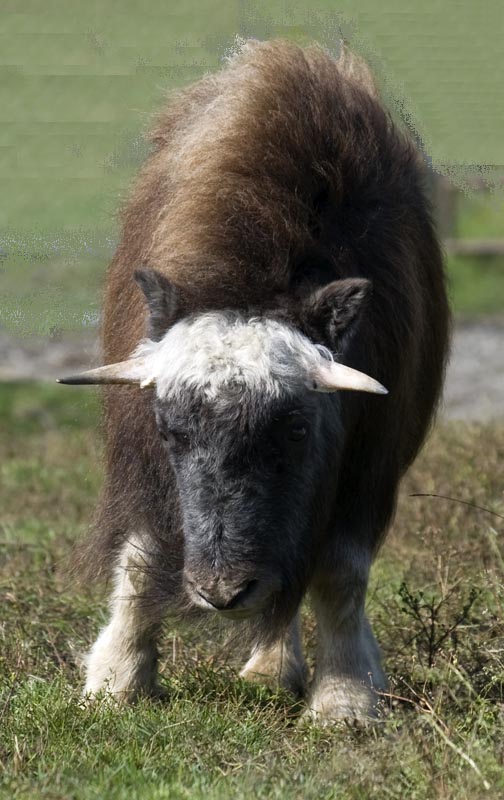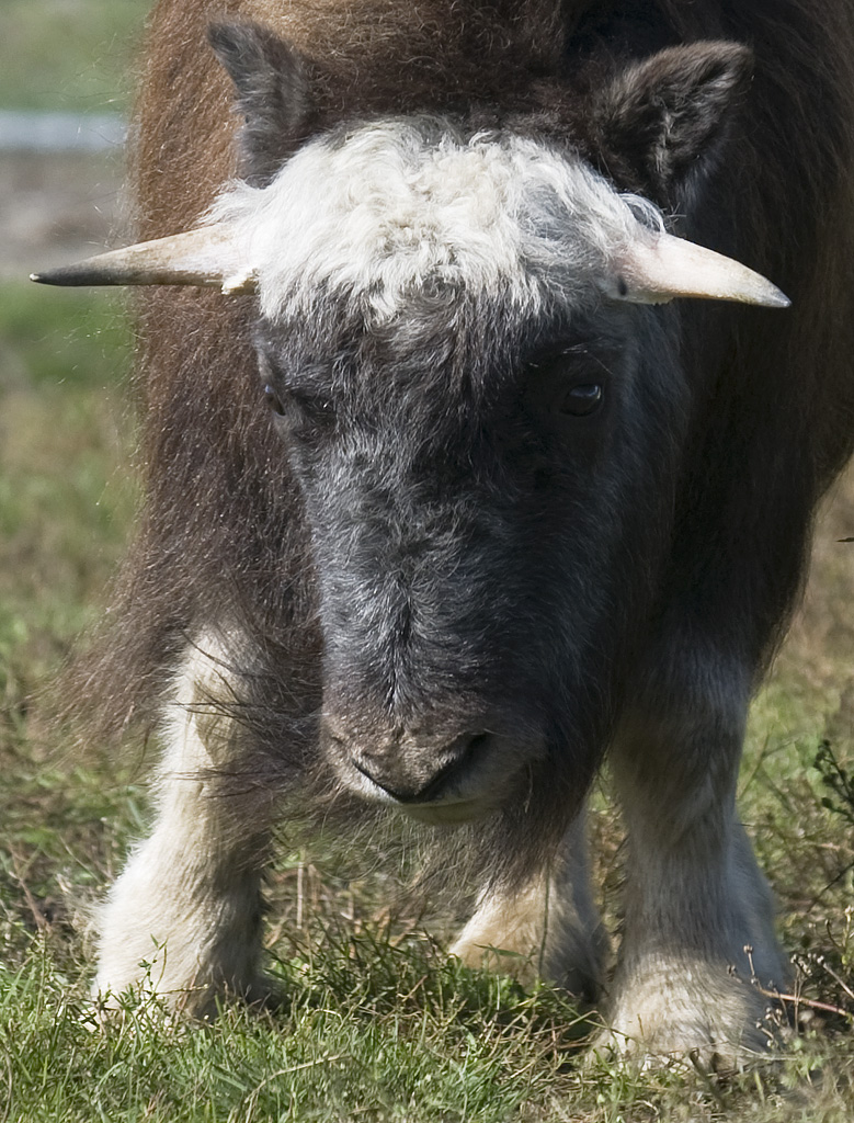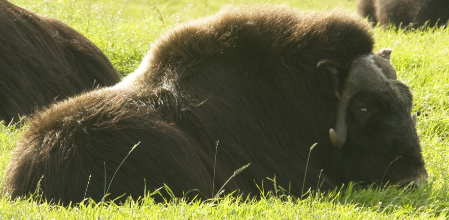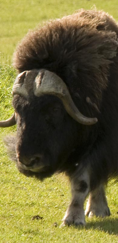 A Muskox yearling on the left and an adult on the right & below at the Muskox Farm in Palmer, Alaska
