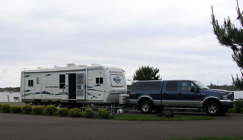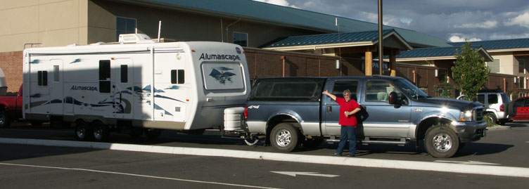 On the way home from Alaska we traded our 1994 Holiday Rambler "Free Spirit" 27CBFK for this brand new "Alumascape" 29FKS. CJ shows it off at R&R RV Center in Liberty Lake, east of Spokane near the Idaho border.
