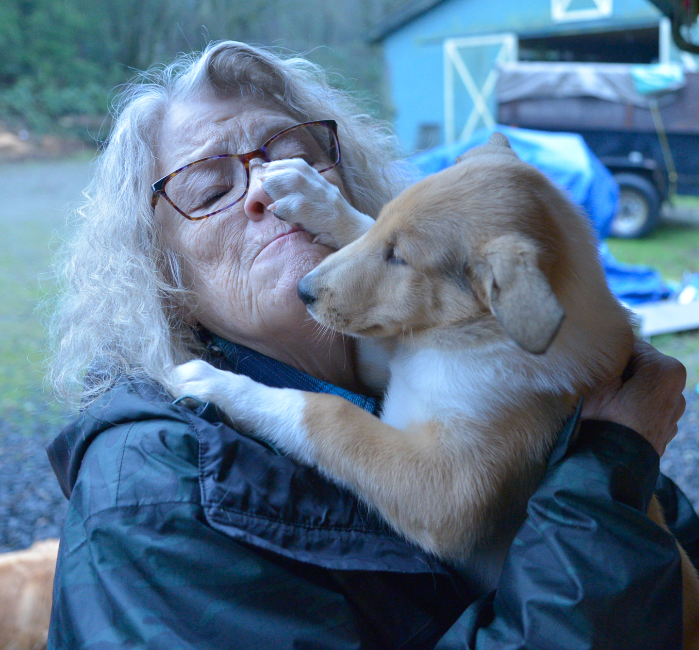 prefer the grass next to the barn. Both of us like to sit on the big